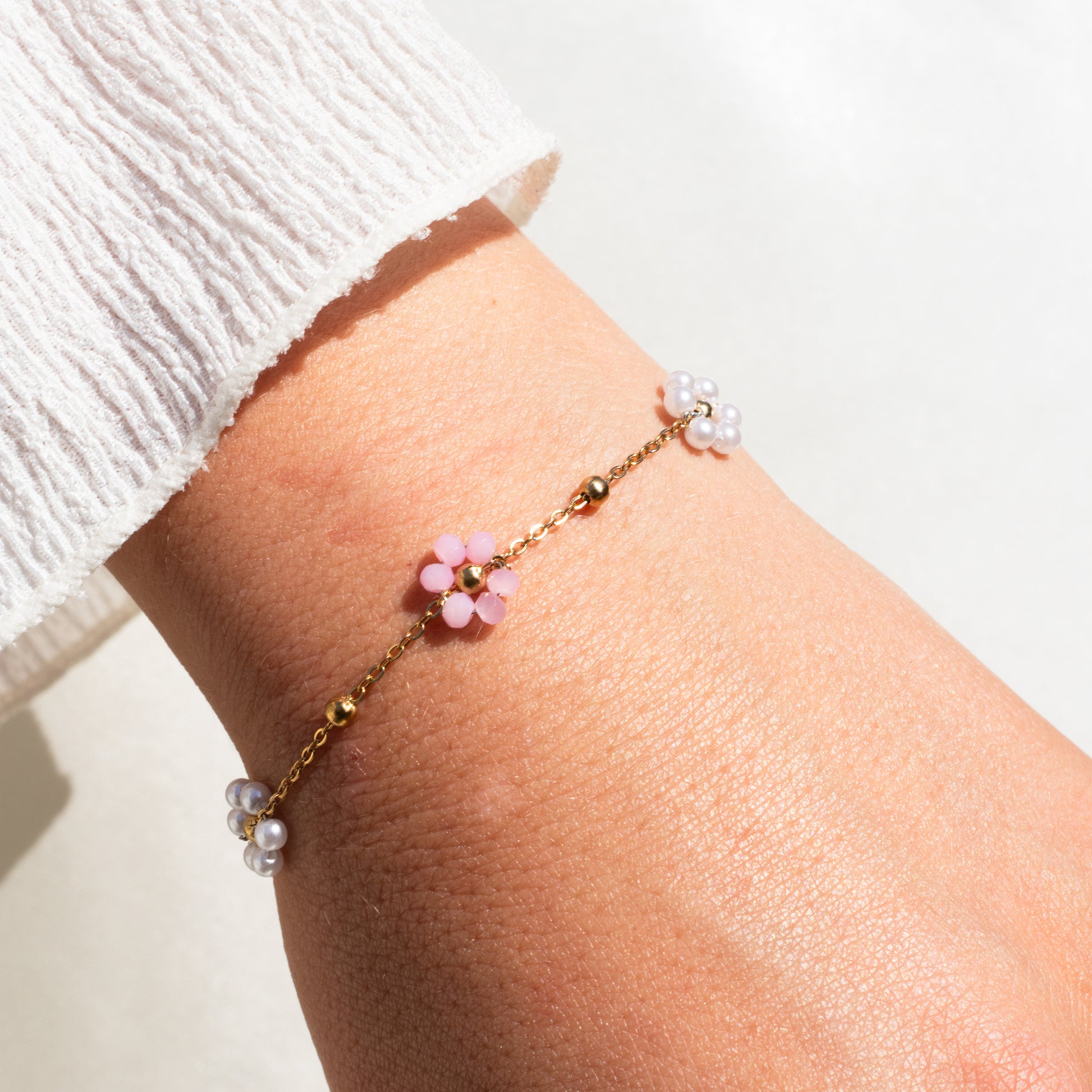 Deze speelse armband combineert vrolijkheid en elegantie in een prachtig ontwerp. Met vijf delicate bloemetjes van fijne kraaltjes is dit sieraad een echte eyecatcher. De bloemen stralen een jeugdige en energieke vibe uit, en voegen een sprankelend accent toe aan elke look. Perfect om je dagelijkse outfit een vrolijke touch te geven. Deze armband is een speels en charmant accessoire dat je direct in een goede stemming brengt en elke pols subtiel opvrolijkt. Combineer deze armband met de Daisy Flower Necklace voor een complete en stralende look!