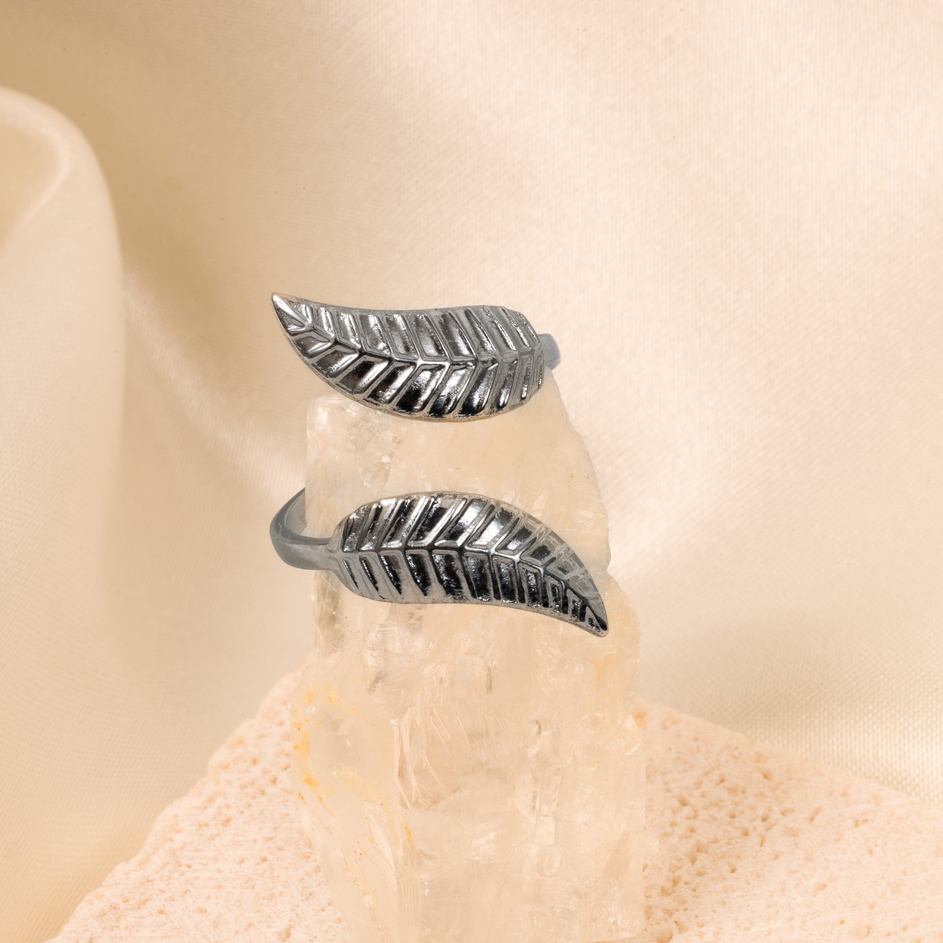 Voel je verbonden met de natuur met deze verfijnde ring, die zich sierlijk om je vinger wikkelt met twee gedetailleerde bladeren. Het elegante ontwerp laat de bladeren subtiel naar elkaar toe buigen, alsof ze je vinger omarmen, en creëert zo een zachte, natuurlijke uitstraling. Deze ring vangt de essentie van de natuur en straalt zowel kracht als verfijning uit.