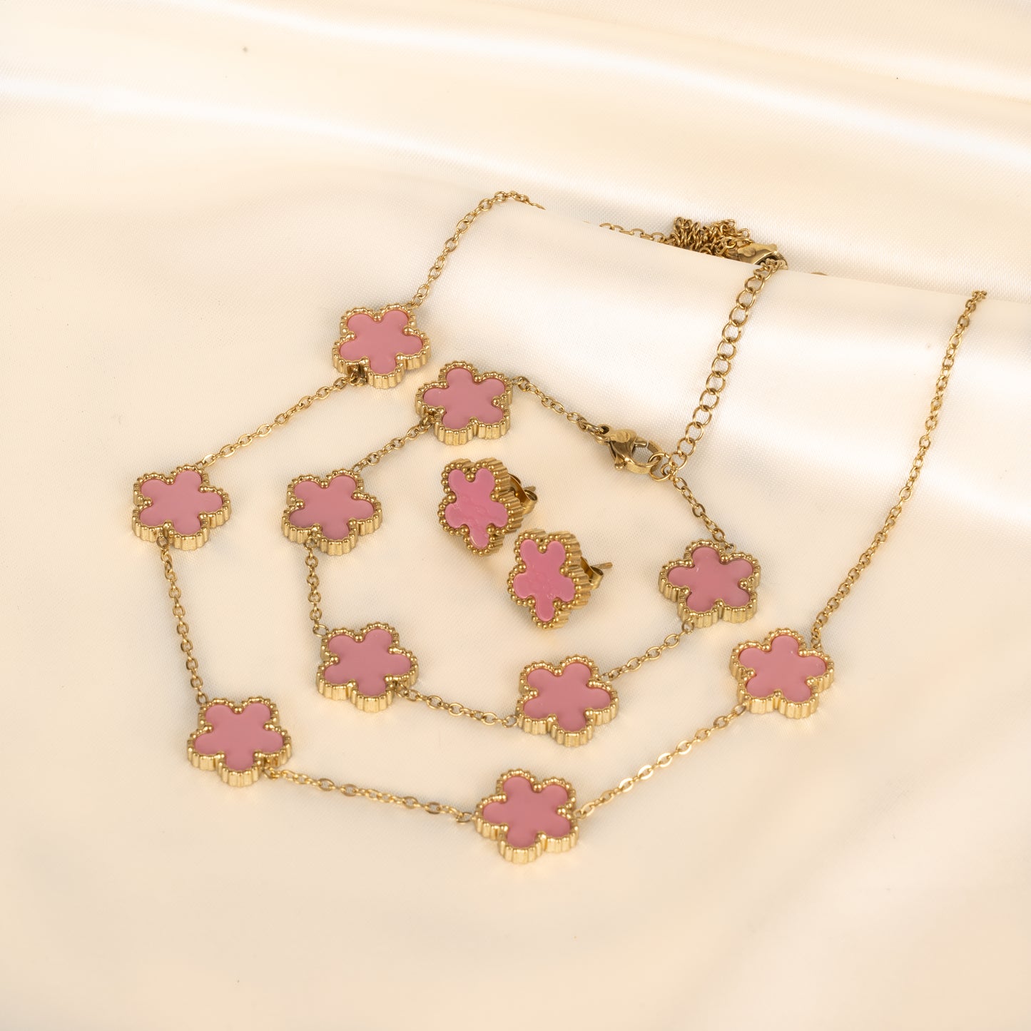 Deze elegante klaver sieradenset bestaat uit een ketting, armband en studs/oorbellen, allemaal versierd met verfijnde klaverbloemen omgeven door een glanzend gouden rand. De klavers zijn one-sided dus de achterkant van de klaver is prachtig goud. Deze zijn ook in het klein in het wit en zwart te verkrijgen of deze set is double-sided te verkrijgen in het wit, zwart of groen. Het gedetailleerde ontwerp en de contrasterende kleuren maken deze set een opvallende keuze voor zowel dagelijks gebruik als speciale gelegenheden. Perfect om jezelf mee te verwennen of als geschenk voor iemand bijzonder. Bij aankoop van deze set ontvang je automatisch €15 korting!