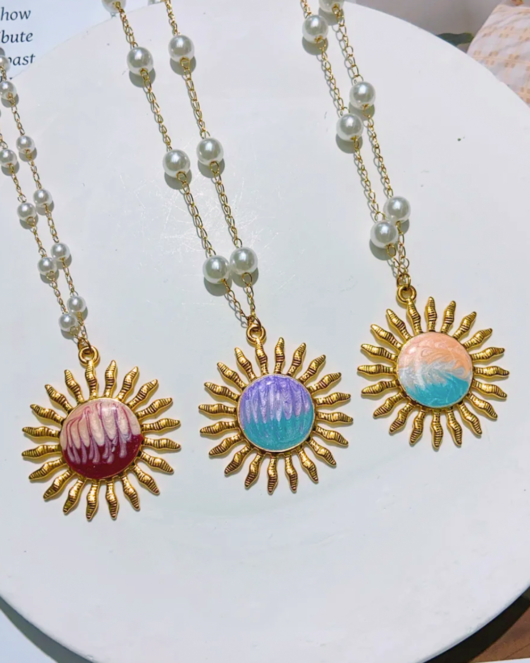 Stralend, elegant en uniek — de Sun Aura Necklace is een ketting die direct de aandacht trekt. Het ontwerp bestaat uit een verfijnde parelketting die prachtig in de hals valt, met daaraan een opvallende zonnenbedel.