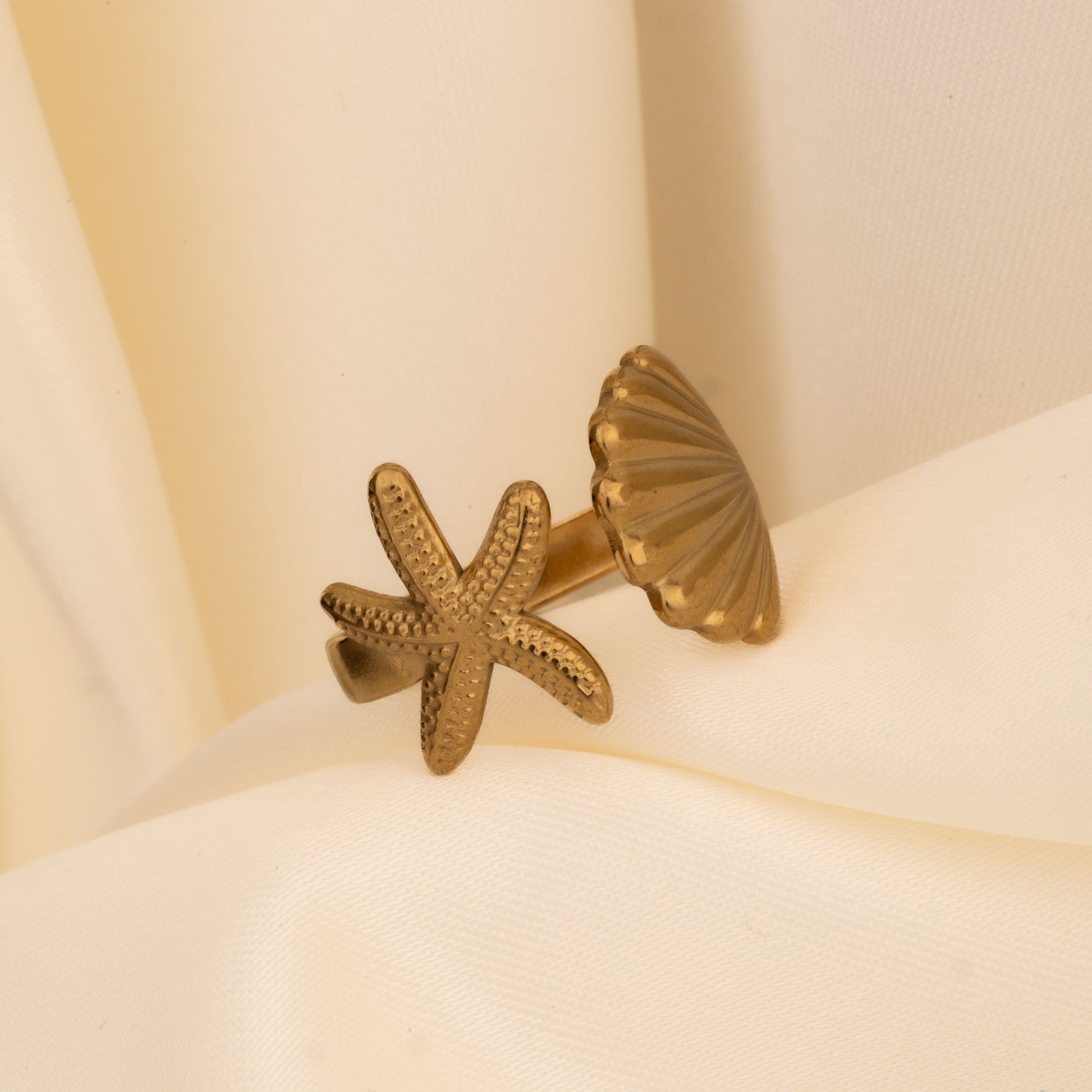 Deze betoverende ring brengt de magie van de oceaan naar je vingers. Het ontwerp toont een zeester en een schelp die subtiel naar elkaar toe bewegen, alsof ze zich in een rustige dans bevinden. De gedetailleerde zeester en schelp zijn met zorg gegraveerd, wat een gevoel van natuur en avontuur oproept. Het ontwerp straalt een elegante en maritieme charme uit.